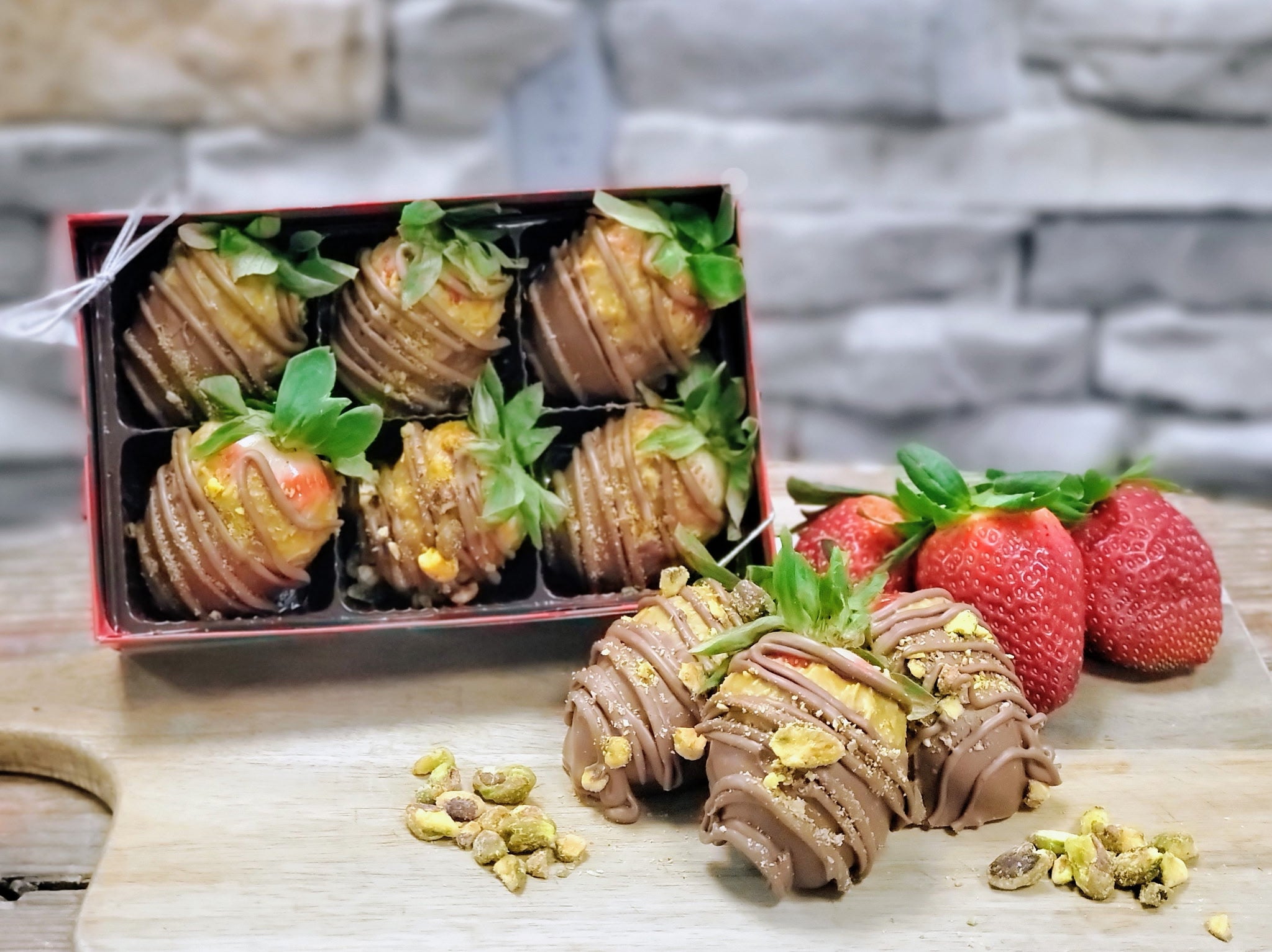Get ready to fall head over heels for our Milk Chocolate Dubai Strawberries—the ultimate Valentine's Day showstopper that'll make your taste buds do a happy dance! Each of these six gorgeous strawberries is dipped in silky milk chocolate and crowned with an enchanting blend of pistachio, saffron, and cardamom that whisks you straight to the glamorous streets of Dubai. It's like taking a luxurious flavor vacation without leaving your kitchen. Fresh, fancy, and absolutely irresistible, these beauties are the perfect way to say "I love you" to yourself or that special someone. Fair warning: they're so fresh and fabulous that we can't ship them, but the good news is they're worth the trip! Grab your box for local pickup on Friday, February 13th or Saturday, February 14th before these limited-edition treasures disappear faster than chocolate at a dessert party.