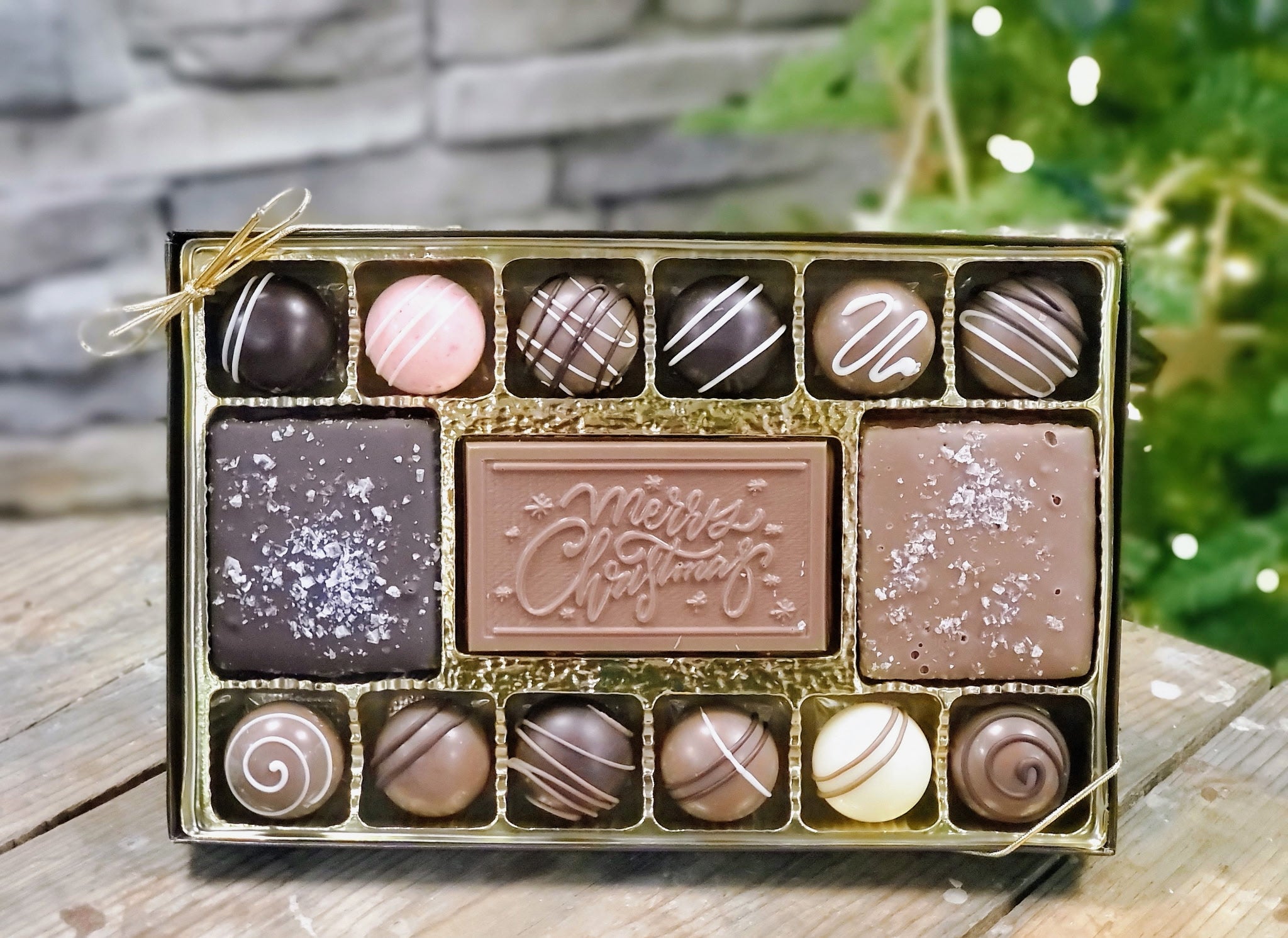 Leave a lasting impression with this deluxe assortment built around the staple products our customers can’t resist. Featuring our House Favorites truffles — including caramel pecan, krispy, and strawberry cream — alongside two salted milk chocolate graham crackers and two salted dark chocolate graham crackers, this collection celebrates the best of Water’s Edge Chocolates. A Merry Christmas solid chocolate logo bar crowns the box, ensuring your gift is remembered long after the last bite.